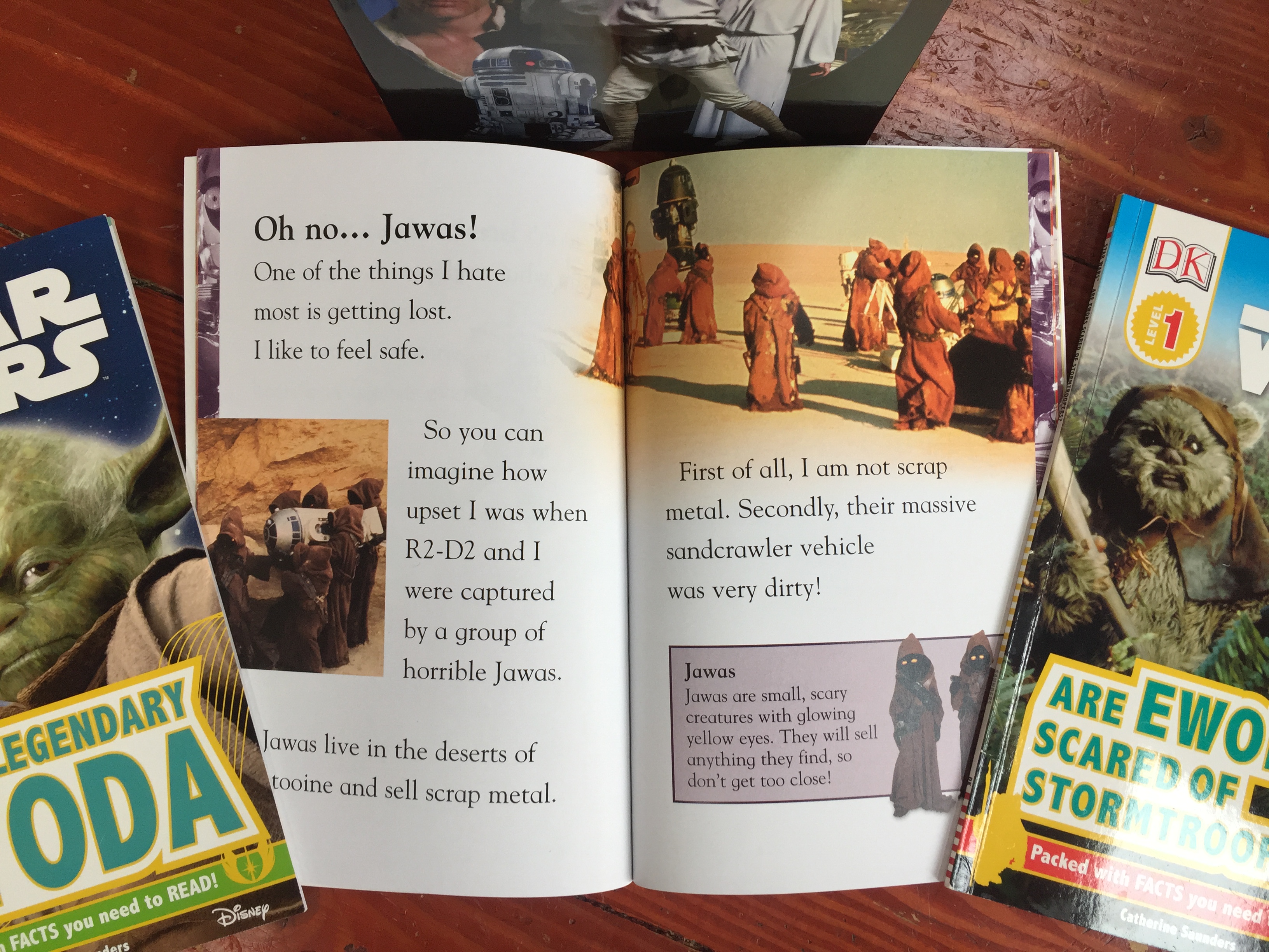 This set comes with twenty titles, including six level one books, eight level two books, and six level three books. Titles include Are Ewoks Scared of Stormtroopers?, What Is a Wookie?, Death Star Battles, and other titles sure to please any enthusiast. The lowest level picture books include a few sentences per page. By the second level, kids get entire paragraphs to read, with more complex vocabulary and bigger words. The third level offers longer stories with smaller fonts and multiple paragraphs chock full of advanced words on each page.