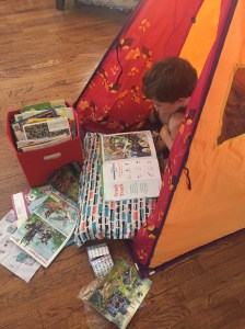 Kid Hang Out: Use materials on hand to carve out a little space for bigger siblings. Even if they share a bedroom, kids can benefit from their own space with visual dividers. Give them a place to curl up and snuggle with their stuffed animal or book, and retreat from the chaos of changing family dynamics. From play tents to forts, to sheets and cardboard boxes, almost anything will do to give them a sense of space and control over their environment in these changing times.