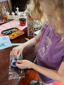 Kids will need to warm the stiff clay by rolling it into balls, then making it into strips. The clay can get hard to manipulate if left out, so it’s best to finish each luminary in one sitting. Kids then mix as many or as few colors together as they’d like. Using the paper guides, roll out the clay to fit the side and bottom cut outs. Once they apply the clay to the outside of the silicon mold, they can punch holes in it to create their own designs with light shining through the gaps. After that step, the entire thing goes into the oven to set. It will also need to cool before kids can remove the mold.