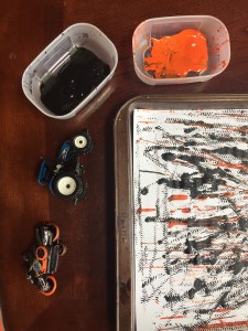 Paint By Car: This project works similarly to painting by marble, but adds another fun element with the car. Take any toy car (Hot Wheels work well) and roll it through a shallow container of paint. Then let kids drive over the paper to make fun tracks and patterns. Experiment with different colors and different cars for more artistic patterns.