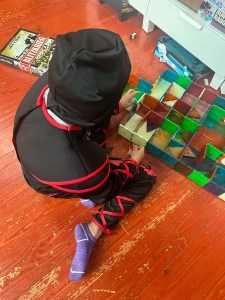 Ninja Costume: This lightweight option works great for playdates long after the trick or treating ends. Kids can put the thin fabric over clothes, so changing in a crowd poses no issue. If they get hot, they can easily remove it. All the extra accessories, like gloves, masks, and weapons, can also be used on their own anytime.