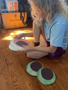 For extra credit, we covered the colored construction paper background of our eyes with glow in the dark paint. We spray painted the cut out circles before the glue step of the process, and waited for the paint to dry. We also covered our finished product in a clear coat to give it more weather resistance. We had both these things left over from other projects. If you don’t have any clear coat spray paint handy, clear plastic food wrap can also help protect the plates from wet weather.