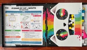 Much like Ghost Castle, the box acts as the playing surface for this pinball-like game. Two players launch tiny catapult balls at each other through the cutouts in the face of a cat. Use the magnetic paw to get all the balls of one color on your opponent’s side of the board to score a point. Be the first player to score five points to win the game.